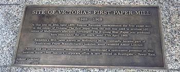 In Victoria, Australia, the first mill struggled into existence on the banks of the Yarra and started up in 1868. There was an earlier mill in Australia, but Samuel Ramsden's South Melbourne mill continued to operate and grow as the forerunner of what became Amcor. The mill initially made coarse board grades and was beset by many difficulties, including a major flood of the Yarra River in 1891. When you go walking around today, there is no sign at all of our proud beginnings. I walked up and down Southbank and could find no evidence at all of the fact that this was a site of the birth of Australia's papermaking. Walter's Wine Bar may contain memories ( Ian Dench says this is where the No. 2 paper machine headbox was located ) but there is no evidence that there was a paper industry started here.