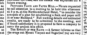 A paper mill was established on the Hunter River in the late 1860's. James Henry Bryant had invented a process for converting waste products such as maize and millet stalks into paper and paper mache and took out a patent for this in 1867.