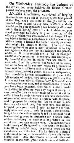 "John Hutchinson, you stand convicted by a Jury of your country, of the offence of which you were indicted - the charge of having falsely forged the acceptance to a bill of exchange, with an intent to defraud the holder thereof, or others who might be interested therein. You have been found guilty of an offence most injurious to society, and against which the law has denouned the penalty of death. It is impossible not to feel the strongest emotions of compassion, at seeing a man like you, in the dreadful situation in which you are placed. A man who from his general knowledge of business, and of the laws of his country, might be presumed to have kept far aloof from such a crime. But it is not from an attention to the general feelings of compassion, that I should be justified in interfering to prevent the full severity of the law, and I deeply regret to say that I have not been able to discover any favourable circumstance in your case, and the transactions in which you have been engaged, from which alone I could be justified in affording you any hopes of mercy."