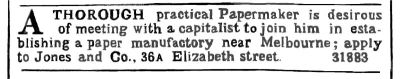 Dear Sir, - In Tuesday's edition of your Journal, 1st page, 4th column, and in the 7th advertisement, read: "A thorough practical Paper-maker is desirous of meeting with a capitalist to join him in establishing a Paper Manufactory near Melbourne. Apply to Jones and Co., 36, Elizabeth-street."